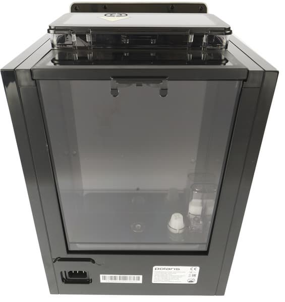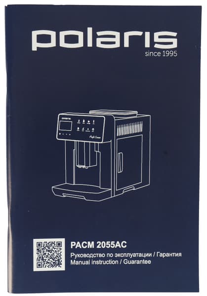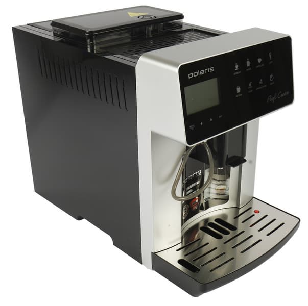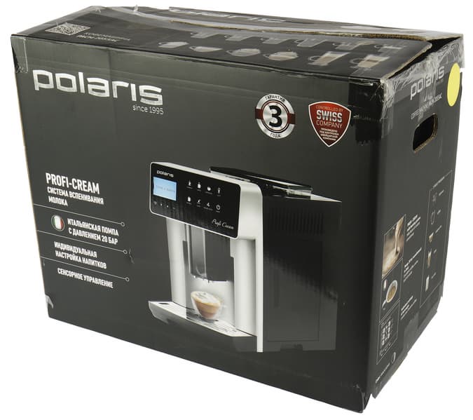 Кофемашина поставляется в объемной картонной коробке, оформленной в фирменном стиле Polaris. Печать на коробке полноцветная. Дизайн строгий: черный фон, небольшое количество ярких элементов, спереди — полноцветная фотография устройства. На боковых гранях находятся кофейных напитков, а также перечислены основные характеристики кофемашины.