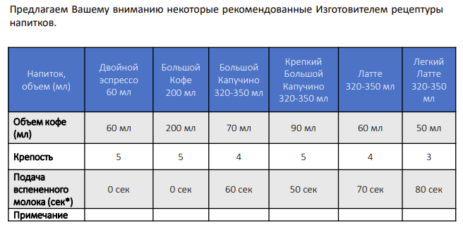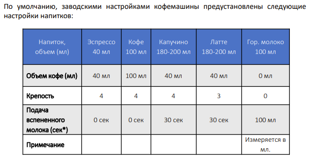 - задать персональные настройки напитков (для каждой из программ выбрать объем напитка в миллилитрах, крепость, а также время подачи молока для латте и капучино)