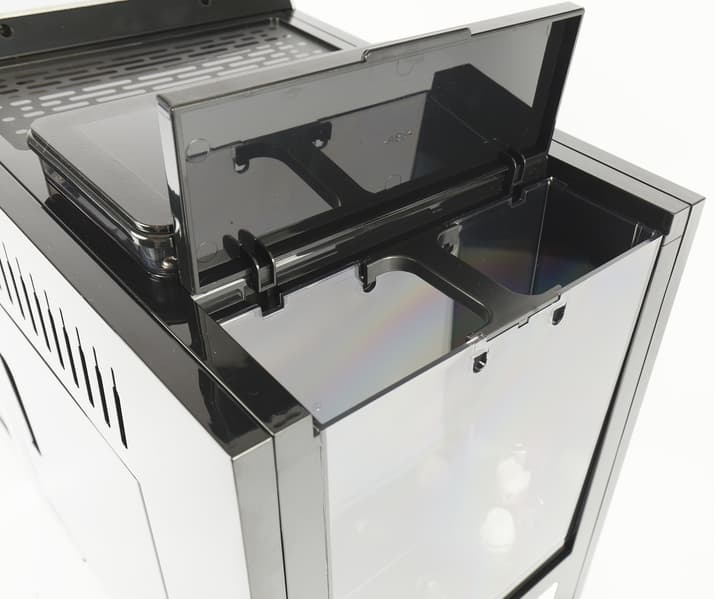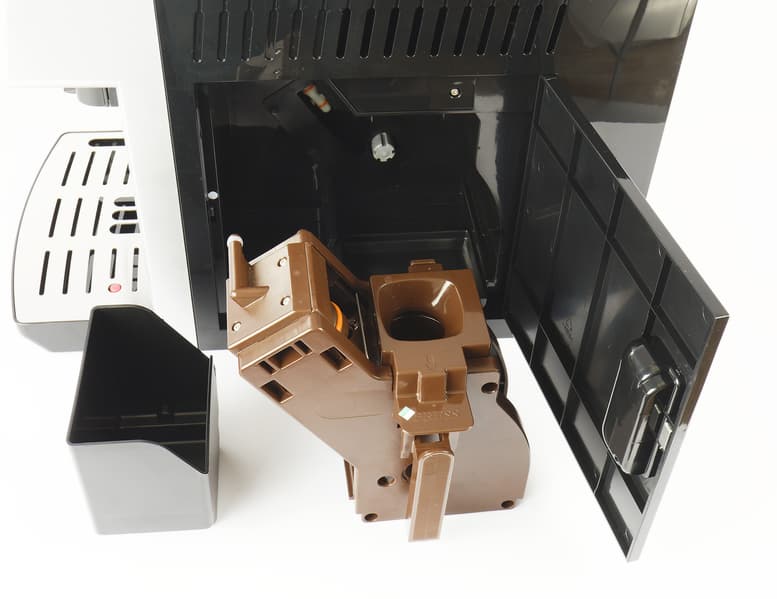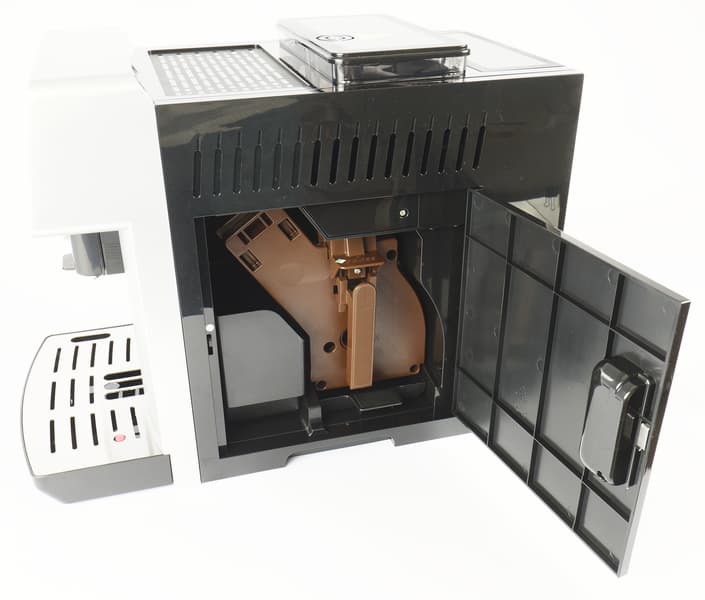 Лючок имеет ручку-защелку и без труда открывается, открывая доступ к заварочному блоку, контейнеру для отработанного кофе и поддону для молотого кофе, просыпавшегося в процессе приготовления.