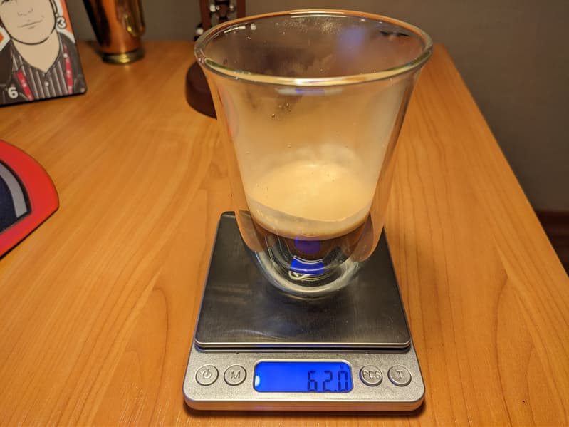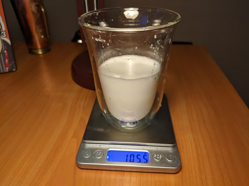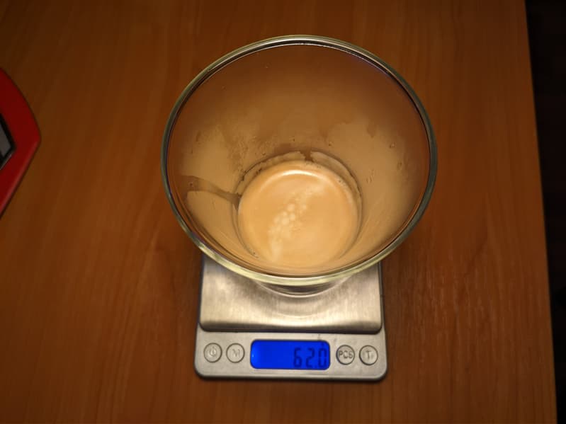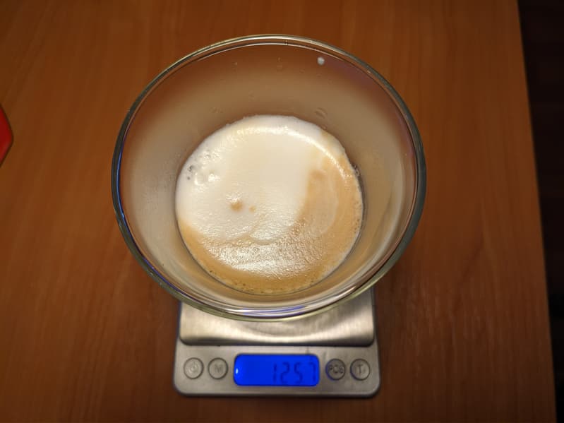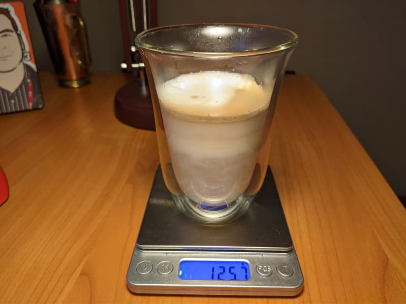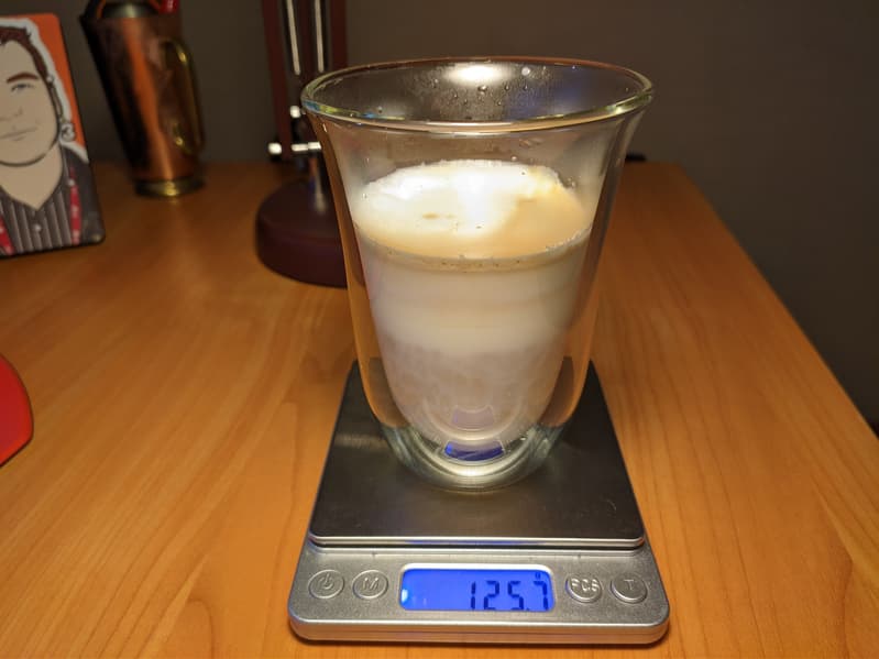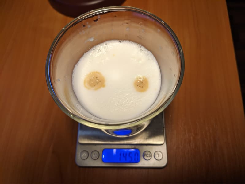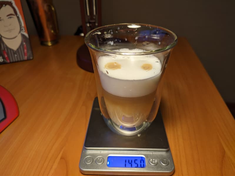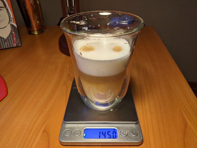 Латте готовится в обратной последовательности: сначала в кружку в течение подается молочная пена, а затем — стандартная порция эспрессо. Настройки тут слегка другие. Молока больше, и общий вес напитка составил 145 г.