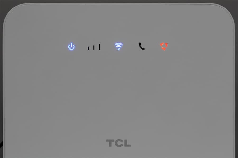 На лицевой панели роутера расположен логотип производителя и пять разноцветных индикаторов — питание, Wi-Fi, сотовая сеть, входящий звонок, статус подключения к интернету.