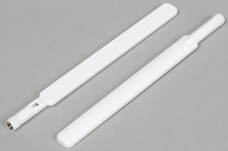 Комплектные антенны достаточно крупные. Длина подвижной части — порядка 17 сантиметров. Наличие съемных антенн позволяет пользователю при необходимости легко подключить стандартные выносные уличные внешние антенны для усиления сигнала.
