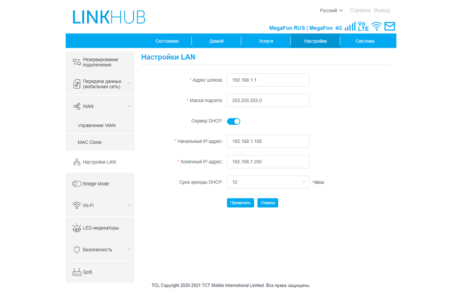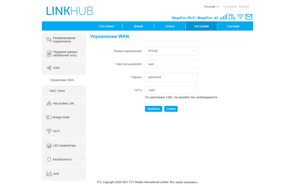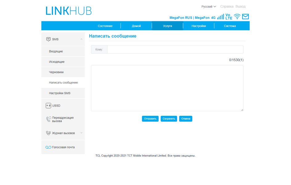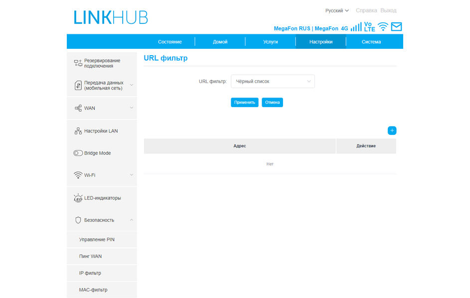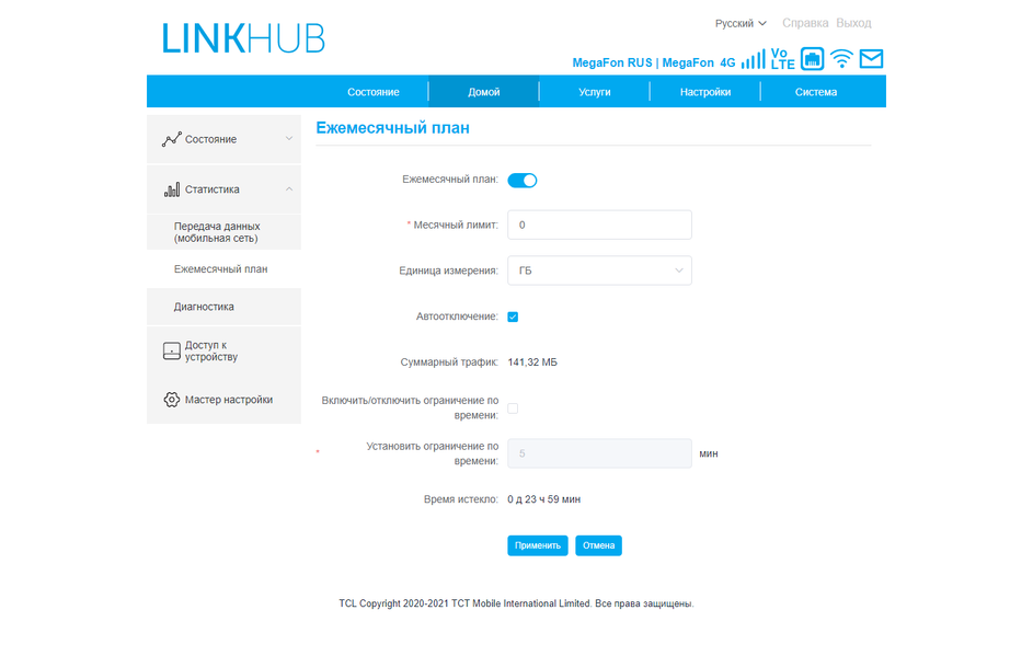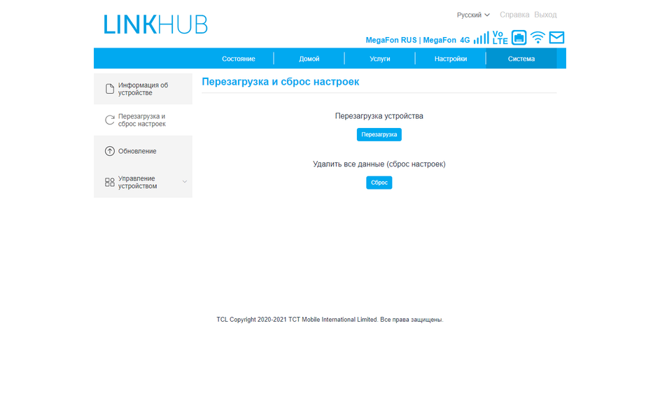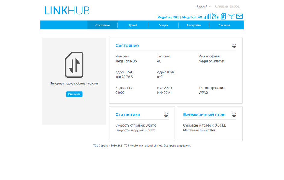 Устройство поддерживает два варианта управления — через традиционный веб-браузер и через фирменное мобильное приложение. Ссылки для загрузки программы указаны на странице входа и на наклейке на корпусе устройства. Посмотрим сначала на первый. Веб-интерфейс представлен на русском языке (можно переключиться и на английский), что упрощает работу с ним. Есть также ссылка на справку (файл PDF на сайте производителя). В верхней части окна справа находится информационный блок с полезными значками — состояние подключения к сотовому оператору, статусы VoLTE, проводного подключения и Wi-Fi, переход к сообщениям SMS.