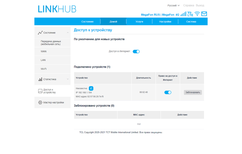 Страница «Доступ к устройству» позволяет посмотреть список текущих клиентов роутера с указанием их MAC- и IP-адреса, а также длительности подключения. Предусмотрена опция блокировки доступа клиентов в интернет.