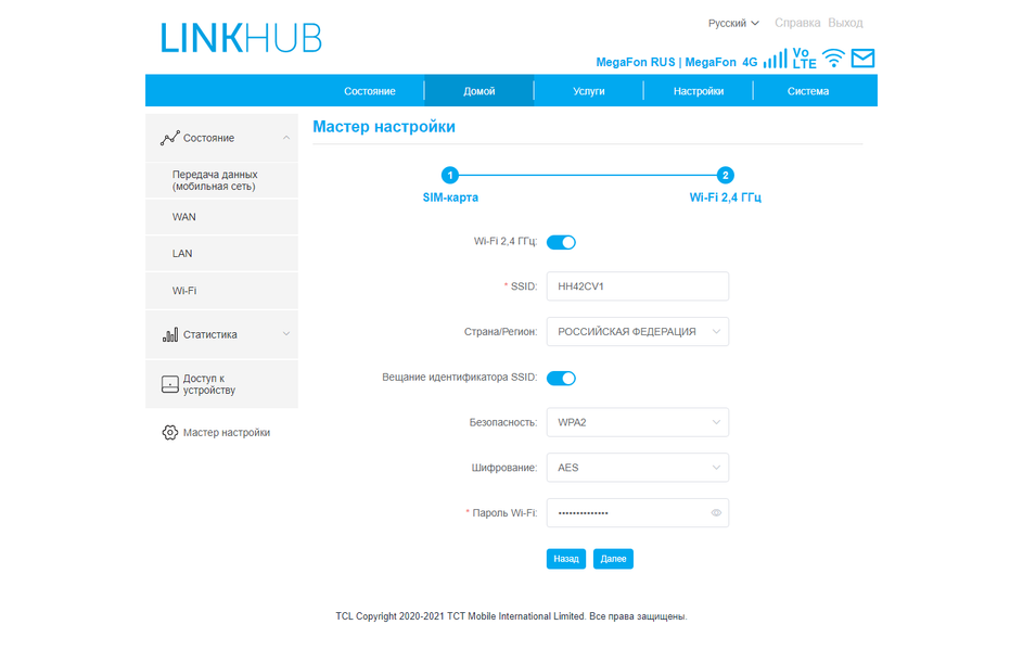 Функция «Мастер настройки» состоит из двух страниц — подключение к сотовому оператору и настройка Wi-Fi. Особого смысла в ней нет.