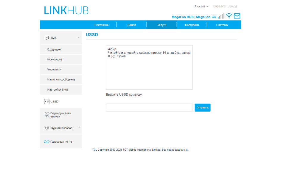 Раздел «Услуги» используется для работы с сервисами сотового оператора. Здесь есть функции приема и передачи SMS (при хранении в устройстве максимальное число сообщений — 255, на SIM-карте — только 15), отправка команд USSD (например, можно узнать баланс), настройка функции переадресации и журнал звонков (до 100 записей в каждом разделе).