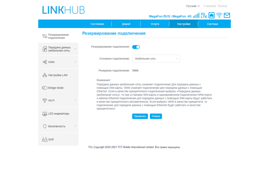 Детальные настройки роутера находятся в одноименном разделе. На первой странице можно включить режим резервирования и выбрать основное подключение. Тестирование показало, что при активном соединении по кабелю используется именно оно независимо от настройки. Если режим резервирования неактивен, возможности выбора рабочего подключения нет.