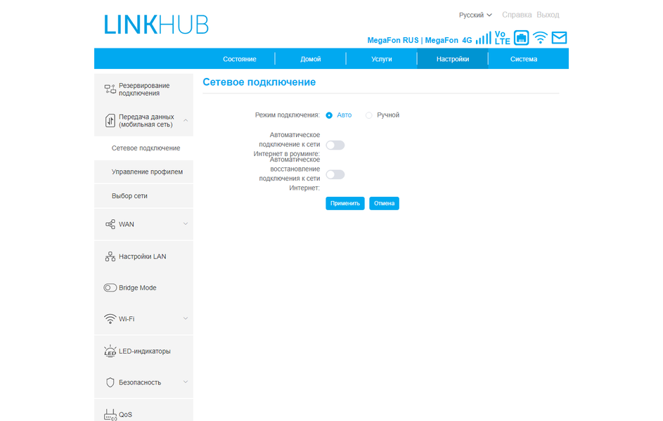 Для сотового модема предусмотрено несколько настроек — автоматический или ручной режим подключения, разрешение работать в роуминге, профиль оператора, выбор типа сети (автоматический, 4G или 3G).