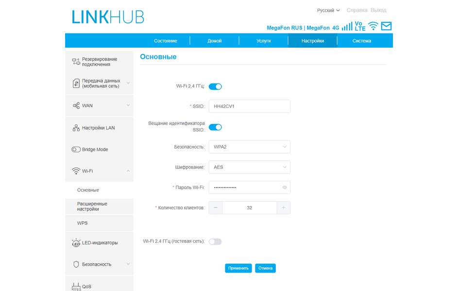 Во втором, «Домой», собрана более подробная информация о работе роутера. В разделе «Состояние» приводятся данные по интерфейсам — подключение к сотовому оператору, портам WAN и LAN, а также точке доступа Wi-Fi.