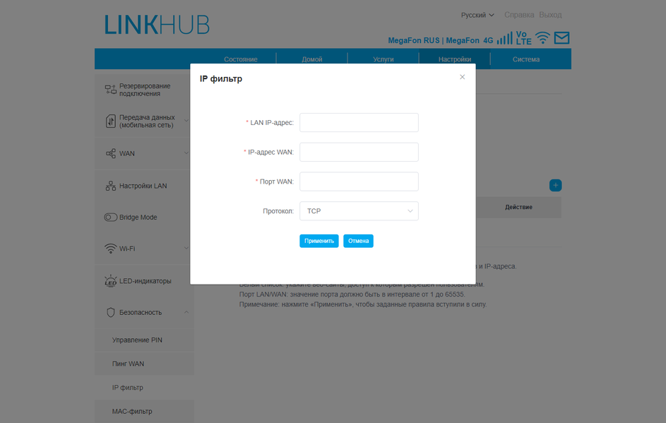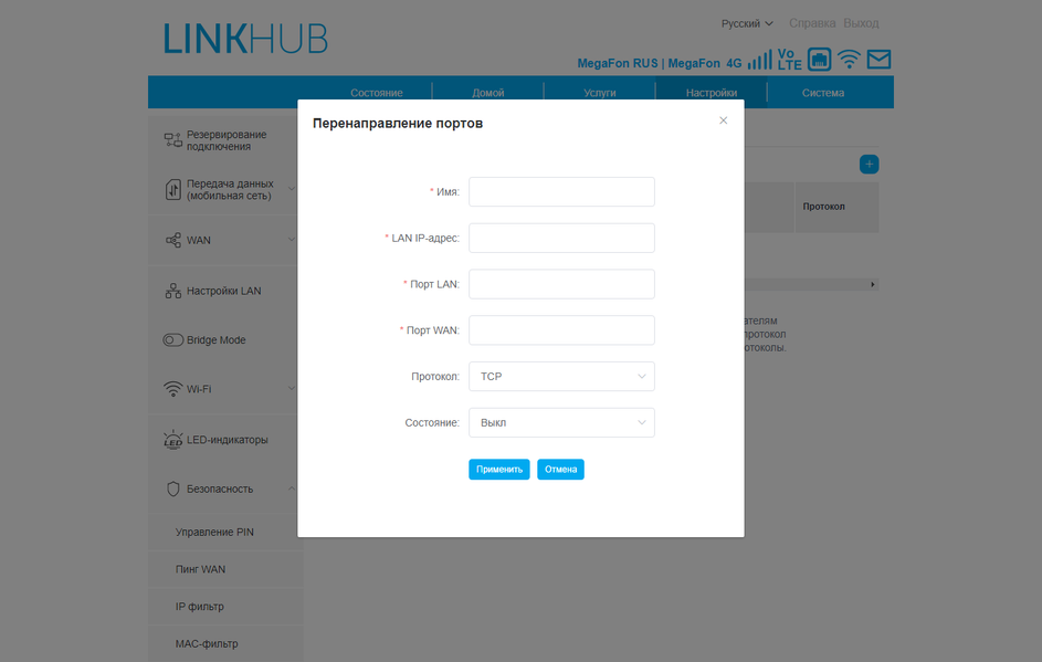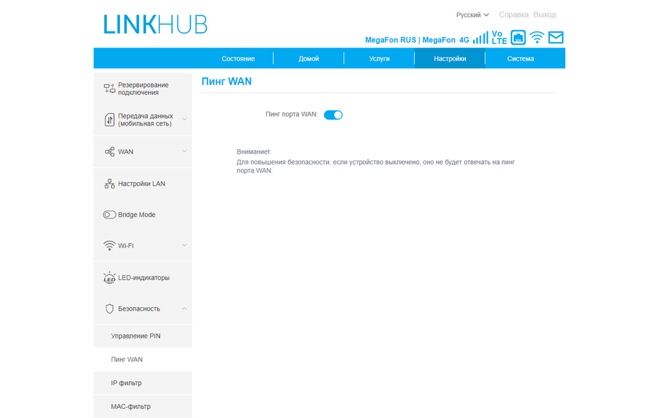 В разделе «Безопасность» более дюжины страниц. В частности, это управление PIN-кодом SIM-карты, разрешение ping со стороны порта WAN, отключение межсетевого экрана.