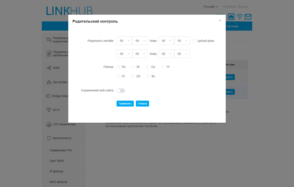 Функция «Родительский контроль» позволяет ограничить клиентам время доступа к сети. Расписание создается на заданные дни недели и может включать до двух интервалов с точностью до 10 минут. Дополнительно в правиле можно указать и список доступных сайтов.