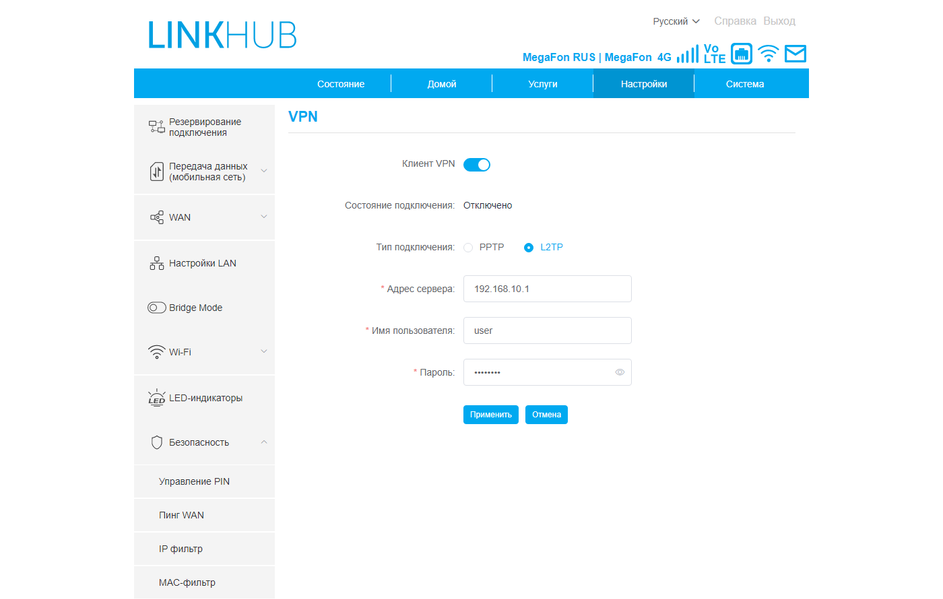 Роутер имеет встроенный клиент VPN с поддержкой протоколов PPTP и L2TP. Никаких особых настроек здесь нет. При активном соединении весь трафик всех клиентов перенаправляется через сервер VPN.