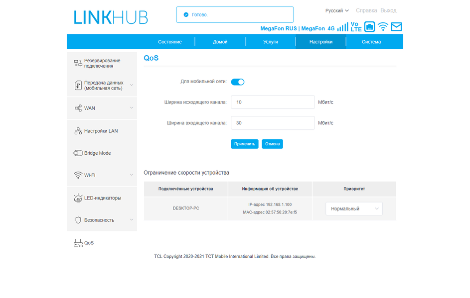 Сервис «QoS» позволяет ограничить общую скорость обмена данными с интернетом, а также указать приоритеты клиентам локальной сети.