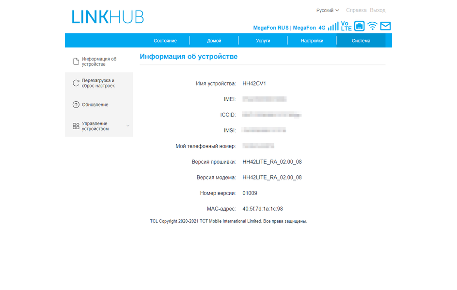 Здесь же можно посмотреть служебную информацию об устройстве — IMEI, IMSI, телефонный номер, версию прошивки роутера и модема.