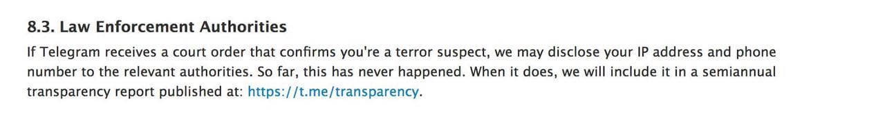 Чтобы получить эту информацию, заинтересованные лица должны предоставить Telegram судебный приказ, подтверждающий, что пользователь подозревается в терроризме. В этом же параграфе Политики конфиденциальности отмечается, что пока такого ни разу не произошло. Если же в будущем такое случится, то информация будет включена в отчёт на специальном канале, который публикуется каждые полгода.