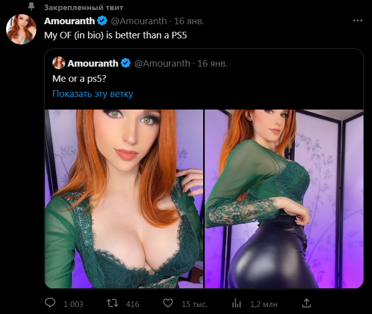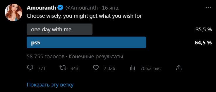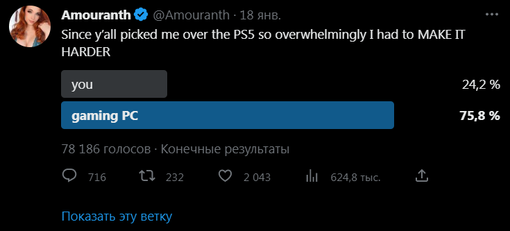 Аудитории на выбор было предоставлено два варианта ответов - провести один день с ней, либо же стать обладателем игровой консоли PlayStation 5. Здесь следует сделать уточнение, что девушка обладает достаточно яркой внешностью, благодаря чему и крайне успешно прославилась. Amouranth полагала, что большинство предпочтёт первый вариант, а именно совместное времяпровождение с ней. Но как говаривал злодей Танос из "Мстителей", реальность оказалась полна разочарований и подавляющее большинство опрошенных предпочло ей игровую консоль. Девушке лишь осталось констатировать, что она считает себя лучше PlayStation 5.