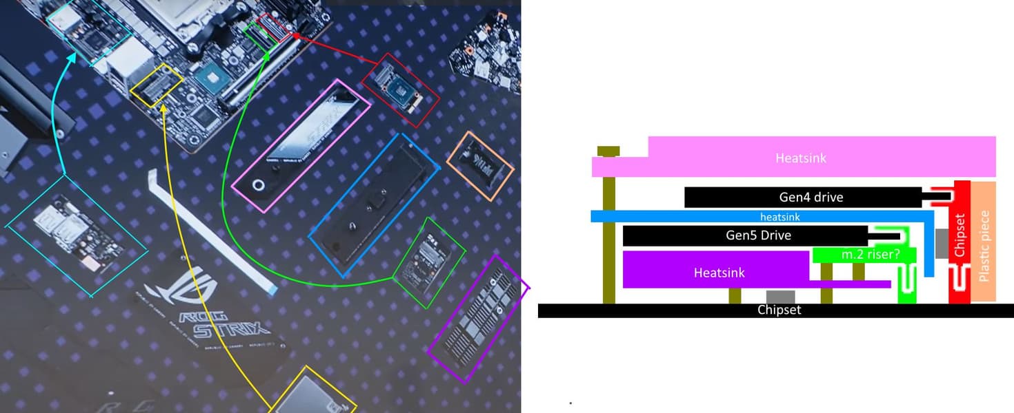 Как можно видеть, это не просто плата — она скрыта за системой охлаждения в полностью собранной плате. То есть пользователь в целом может и не догадываться о такой необычной конструкции. Сделано это для того, чтобы сэкономить место на и так небольшой плате формата Mini-ITX.