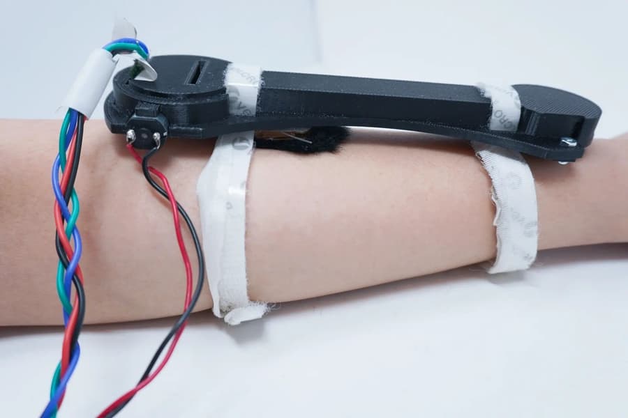 Исследователи создали носимый аксессуар, который включает в себя электромотор, пружину и некоторые другие детали. Но самым важным стал кусочек синтетического меха, который движется и гладит человека по руке.