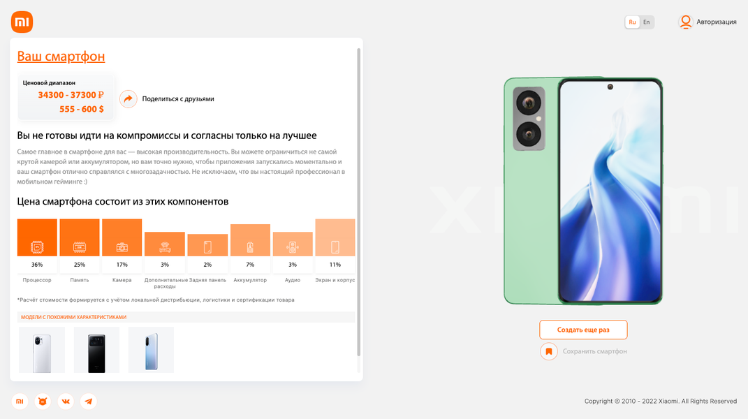 В конце смартфон «собирается» и пользователю сообщают примерный ценовой диапазон такой комплектации с указанием, какие из комплектующих сильнее всего повлияли на стоимость. Чтобы сохранять собранные смартфоны, необходимо авторизоваться.