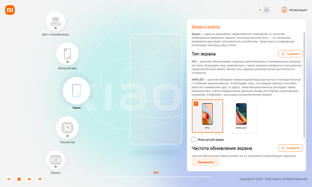 Конструктор доступен на английском и русском языках, включая и описания с пояснениями. Технологии можно сравнивать между собой, дополнительно указывается, в каких моделях Xiaomi и Redmi они используются.