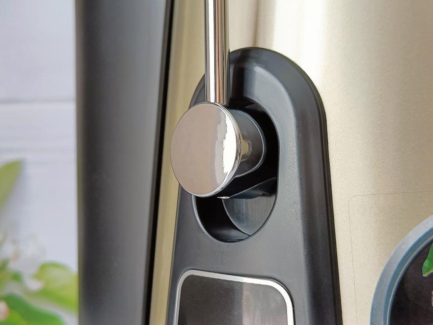 Скоба для прижима крышки вручную опускается спереди соковыжималки, нареканий данный момент вообще не вызывает, сборка качественная, пластик толстый, металл надежный.