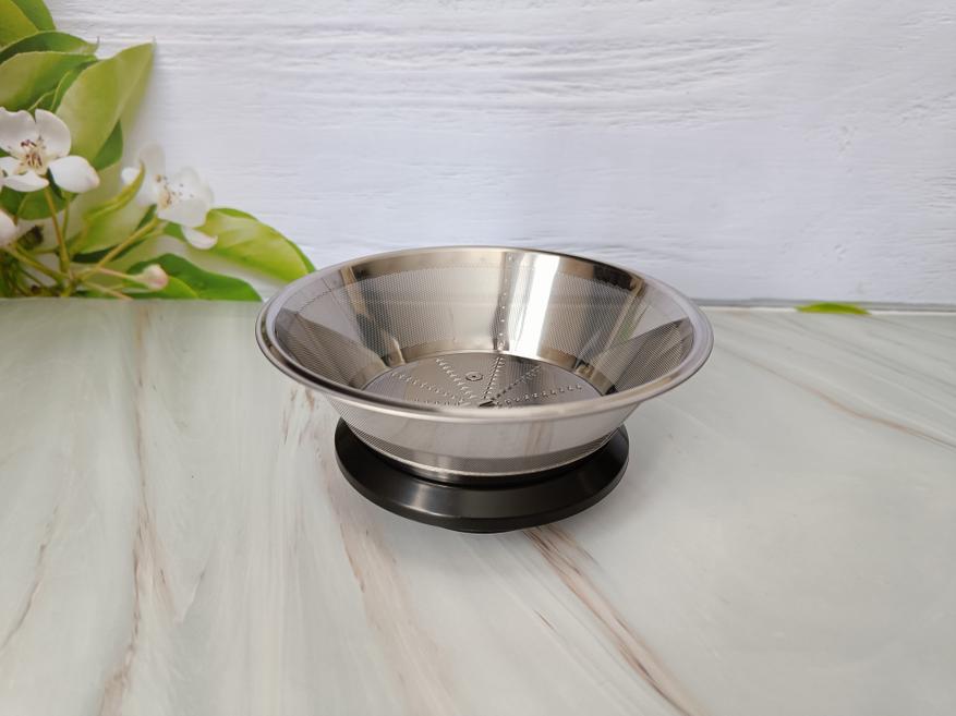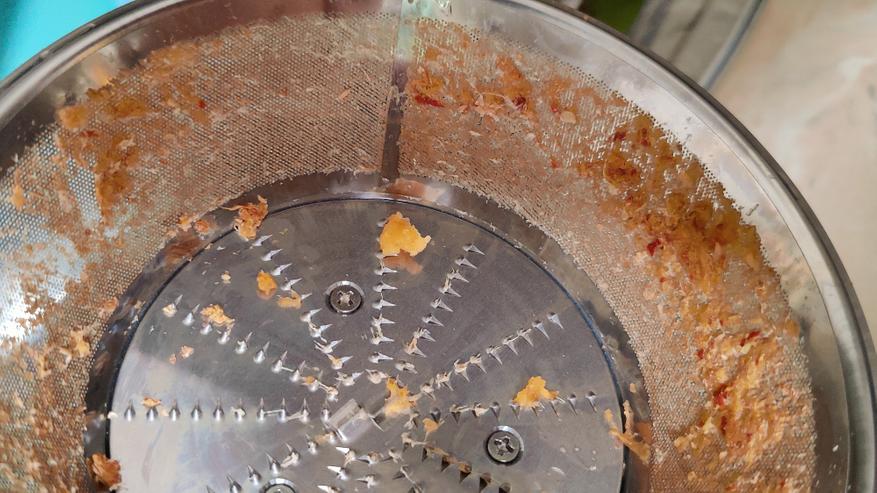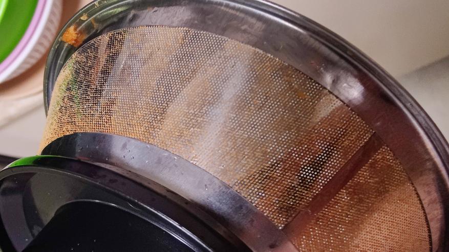 Сок не попадает никуда мимо внутри соковыжималки, а фильтр заметно, что отжимает качественно, с сухими остатками яблок.