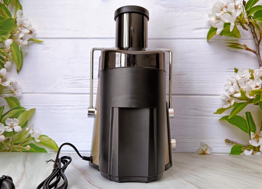 Корпус соковыжималки сделан по всем канонам соковыжималок. Вполне классический корпус для подобных устройств. Корпус из нержавеющей стали и черного пластика. Металлические части окрашены в бронзовый цвет.  С основной стороны, которая при работе будет обращена к пользователю есть переключатель скоростей. Выше размешена скоба фиксации крышки в хромированном исполнении.  На корпусе размещены наклейки о пользе сока и продублированы основные преимущества модели. Также заметен логотип производителя