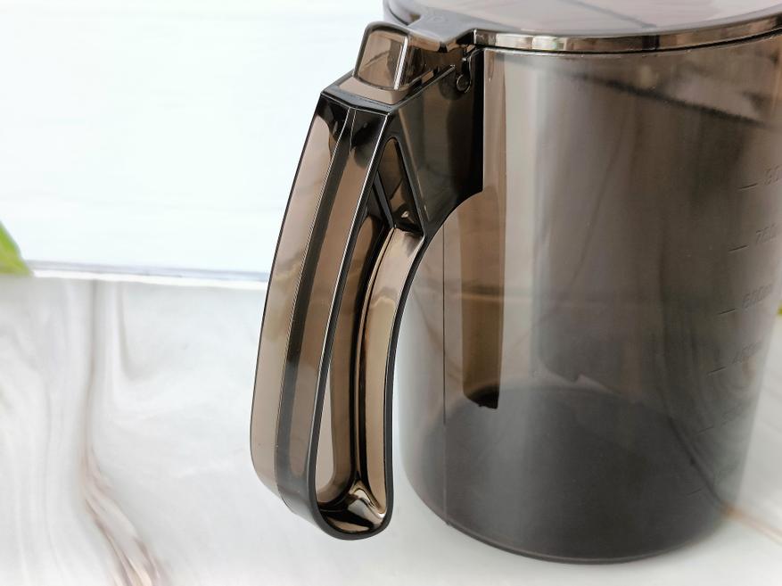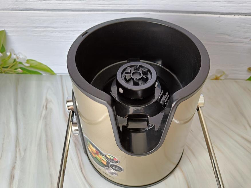 Со второй стороны мы видим только вход скобы для фиксации крышки, а спереди носик для вывода сока из отсека для отжима. Контейнер для жмыха отлично вписывается в общий вид, дополняя корпус соковыжималки.