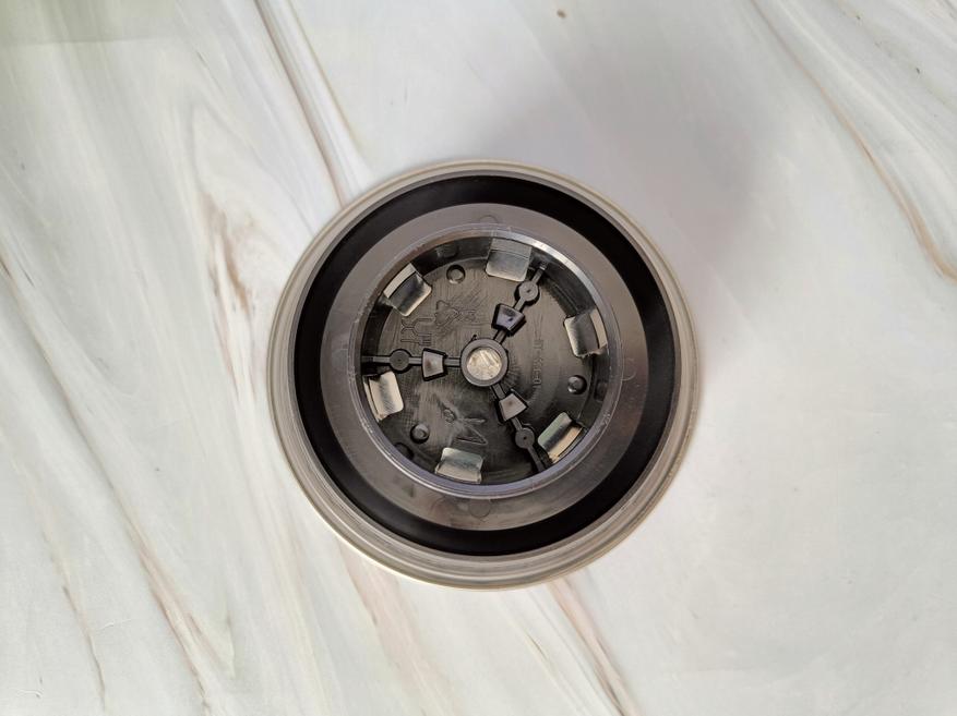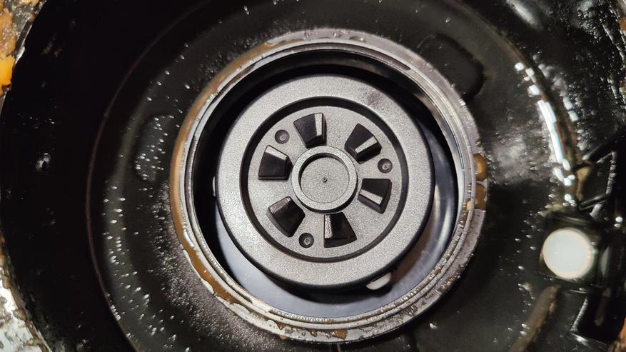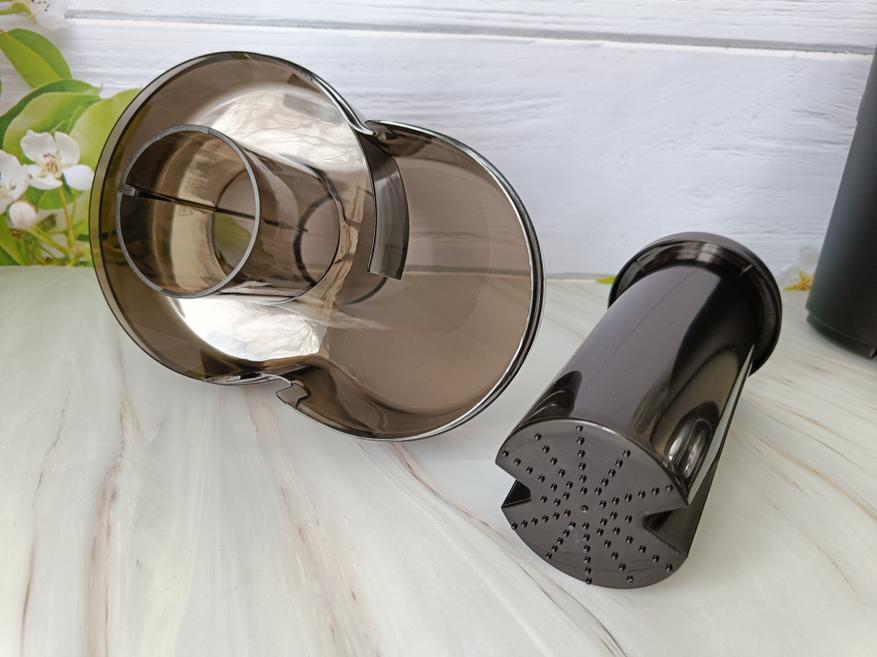 Для начала вымоем все части соковыжималки, а для этого нужно ее разобрать. Опускаем скобу, снимаем крышку, открывается вид на следующие составные части.  Для предотвращения разбрызгивания вверх и для проталкивания продуктов в зону отжима сверху имеется толкатель объединенный с крышкой. На основании толкателя имеются пластиковые выемки для большей эффективности. Чтобы толкатель всегда вставлялся корректно, на корпусе горловины есть выемка, соответствующая насечке на толкателе.  Под крышкой мы видим фильтр с лезвиями для отжима  сока из нержавеющей стали.