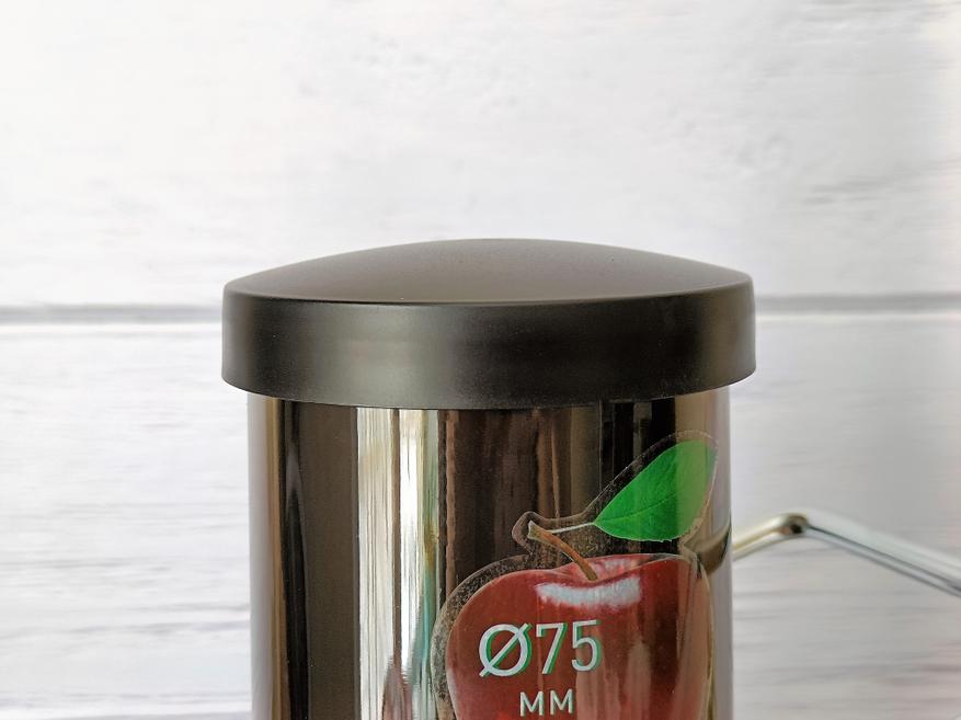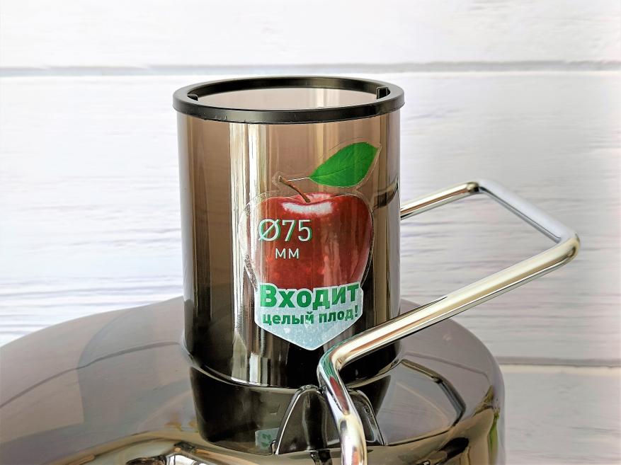 Посмотрим на соковыжималку сверху чуть детальнее. Сверху мы видим просто огромную горловину, на которой красуется наклейка с целым яблоком. Я обычно яблоки прямо так не отжимаю, ведь нужно вырезать семечки, но в случае с другими овощами или фруктами это просто находка. Скоба из толстого металла плотно прижимает крышку, войдя в специальную выемку пластикового фиксатора.