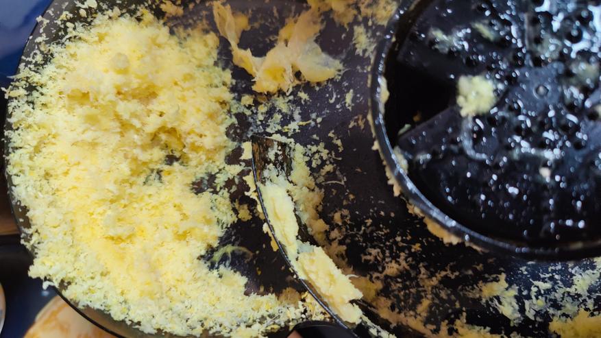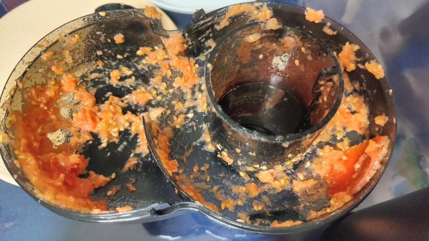 Жмых немного остается в крышке и падает поочередно в емкость для жмыха. Жмых не просто не сочный, он вообще как едва влажный опилок. Отжимает максимально качественно. Жмых использовать как овощное пюре не получится, очень сухой.  Это прекрасно отражает эффективность отжима.