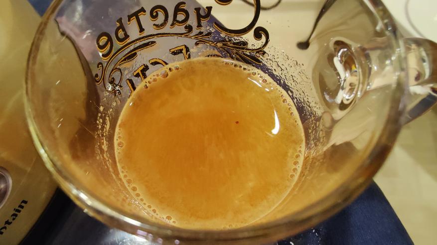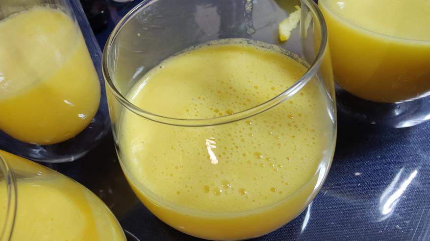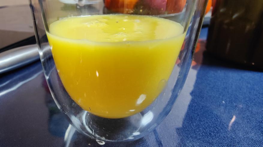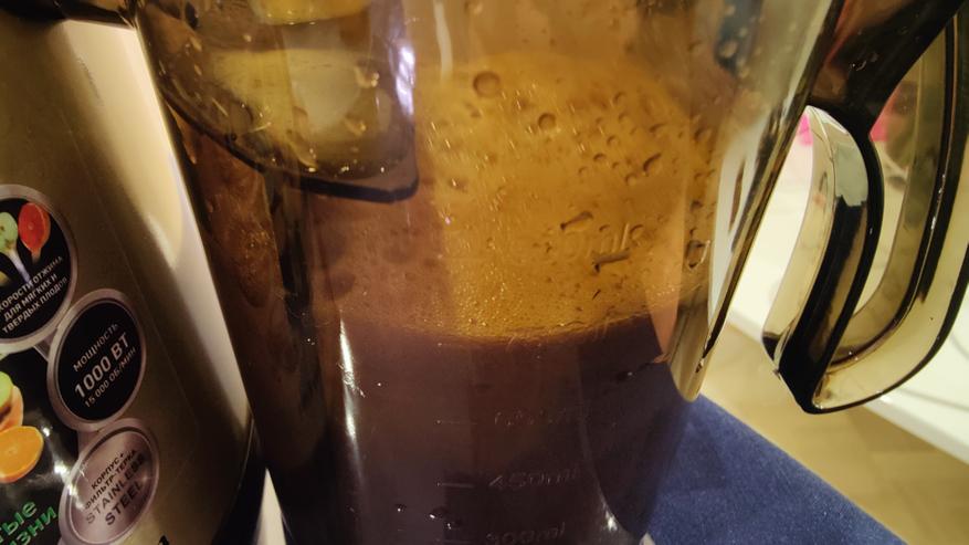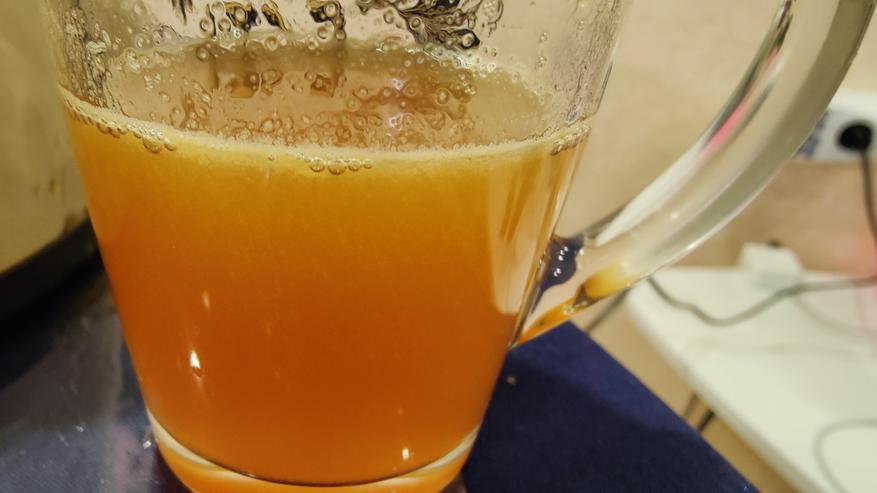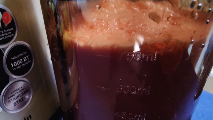Сок просто удивил, если не допустить перетекания пены в стакан, он практически прозрачный, мякоти и пены не пропускает стакан соковыжималки. На фотографии я этого кадра не поймал, тут уже вместе с пеной сок.