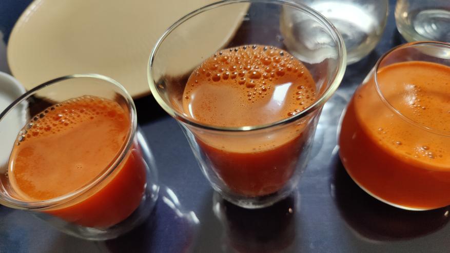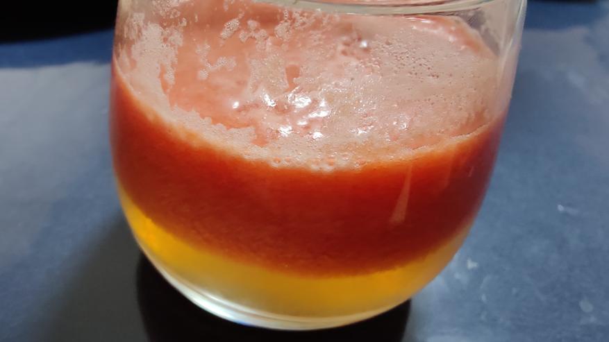 Сок томатный он только из пачки красивый, сразу из соковыжималки он взбитый весь в пузырьках, плюс оседает