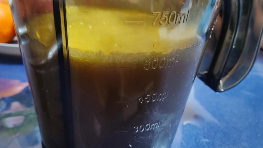 На выходе получаем около 600 мл сока и 328 грамм очень сухого жмыха. Стоит отметить, что на входе апельсинов было 920 грамм.