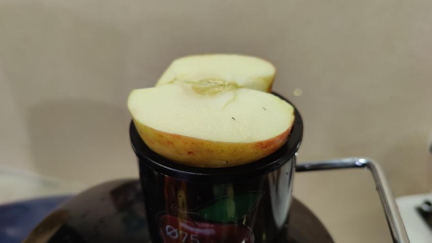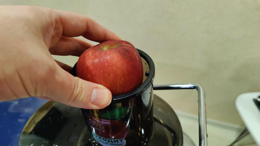 Горловина широкая и яблоки до 75мм диаметром гипотетически можно засовывать целиком. Более крупные нужно порезать