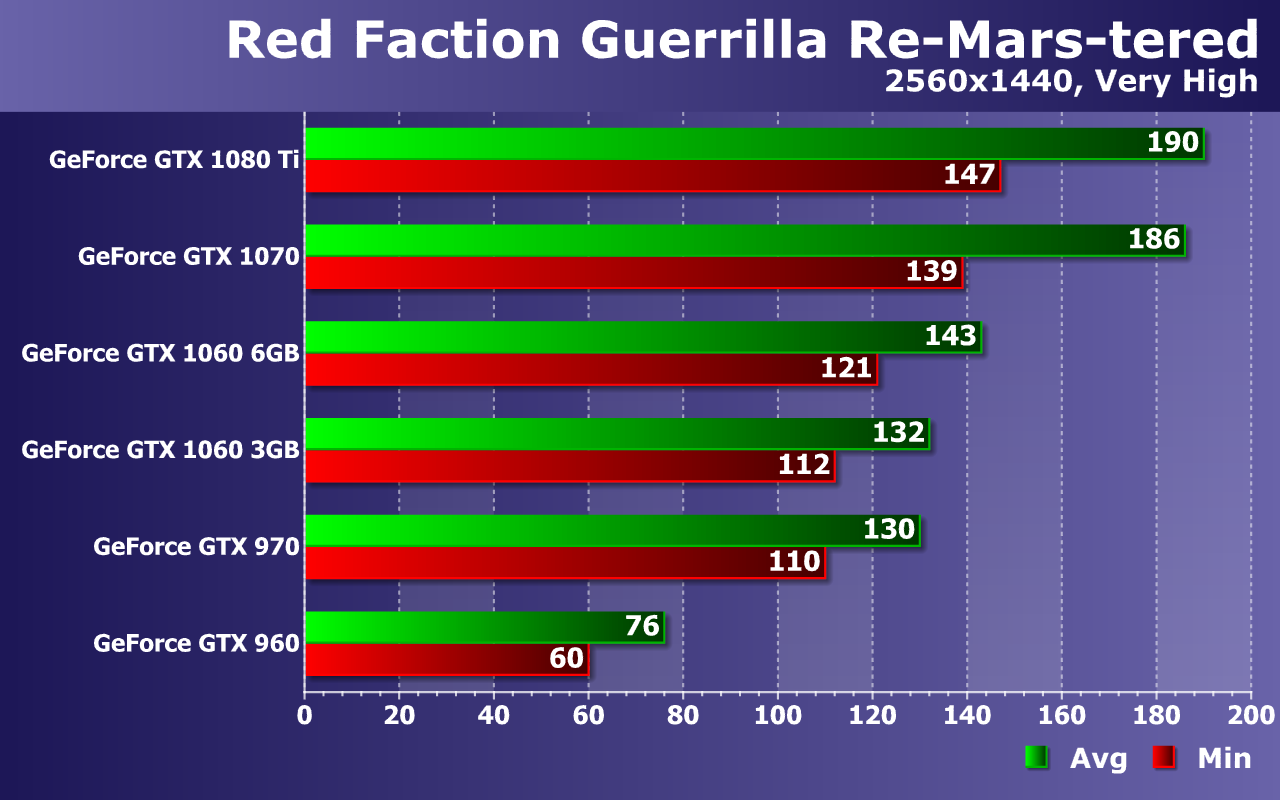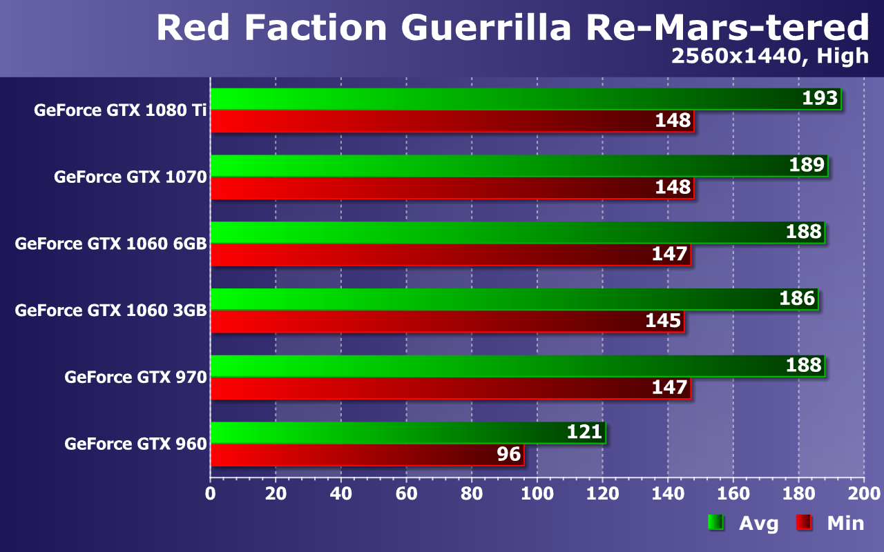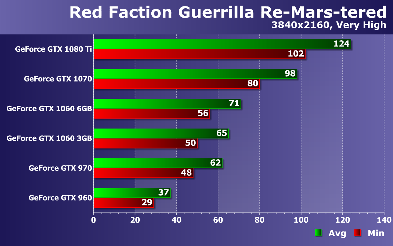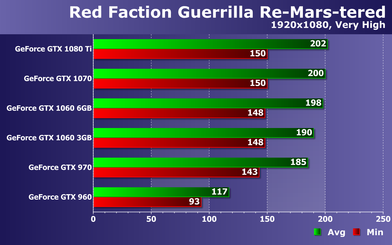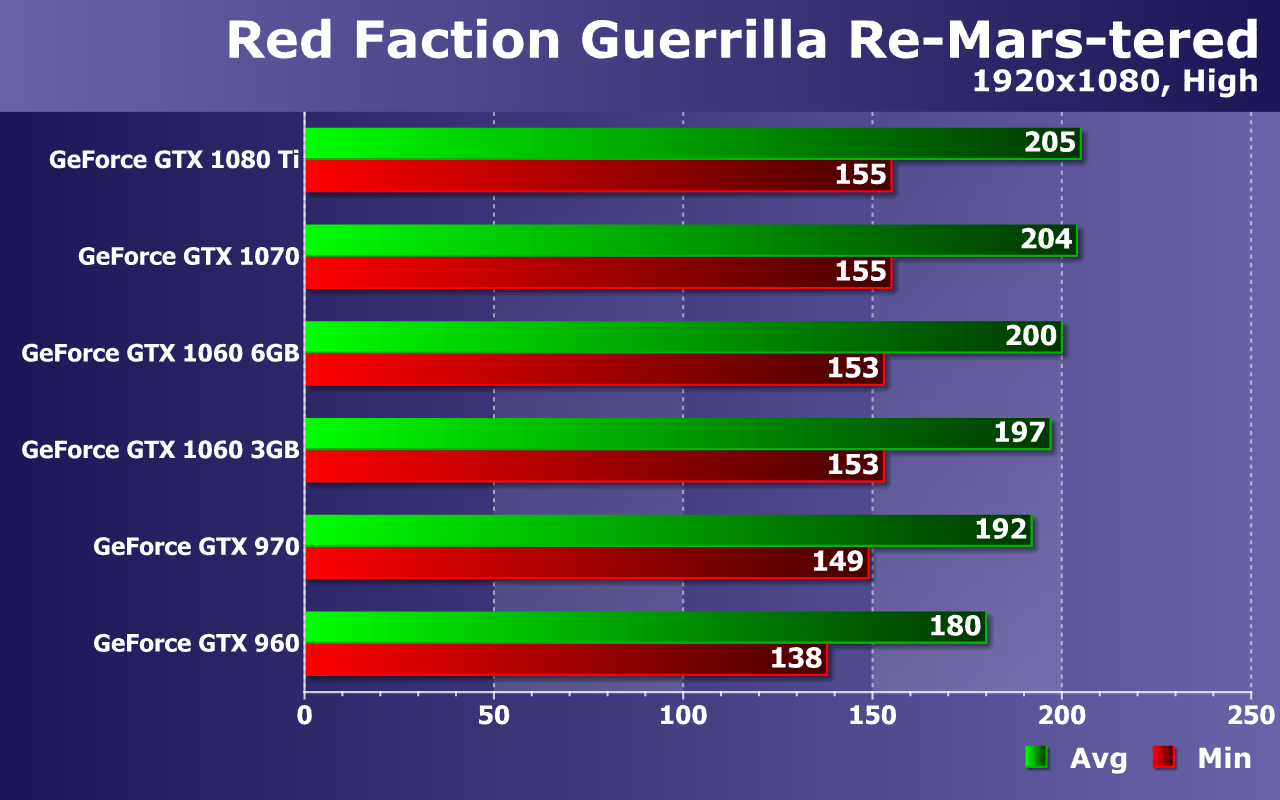 Остальные GeForce показали результат заметно лучше даже максимально комфортных условий. Тройка середнячков не опускалась ниже 79-85 FPS с более чем 100 FPS в среднем, поэтому играть на них будет весьма приятно — этого хватит самым требовательным игрокам. Как видно, даже такие сложные условия не раскрыли недостаток 3 ГБ видеопамяти у младшей модели GTX 1060 — в игре Red Faction Guerrilla Re-Mars-tered две модели видеокарты с разным объемом VRAM по скорости отличаются слабо, и вдвое больший объем видеопамяти не дает никаких преимуществ старшей модели.