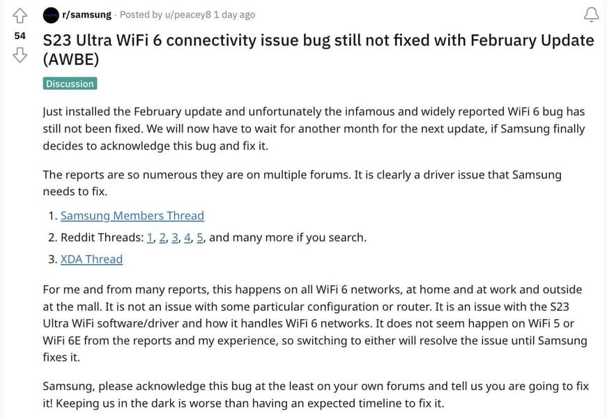 Пользователи отмечают, что наблюдается она с разными роутерами и сетями Wi-Fi 6, как дома, так и на работе или в других местах. То есть дело именно в телефонах. Samsung на днях выпустила первое обновление ПО для Galaxy S23, но оно если и исправляет проблему, то далеко не у всех. А до тех пор, пока проблема существует, совет лишь один – использовать иные стандарты подключения к Wi-Fi. Например, Wi-Fi 5.