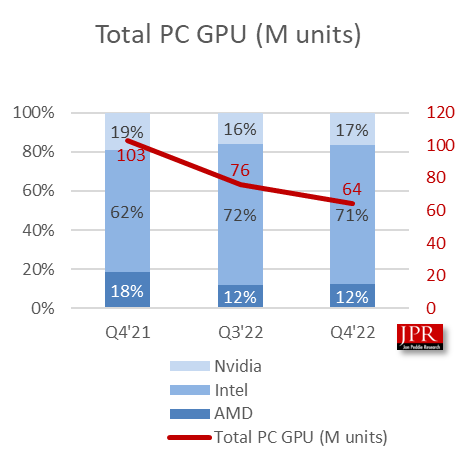 Согласно данным аналитиков Jon Peddie Research, поставки графических процессоров для ПК в прошлом квартале составили всего 64,2 млн единиц, что соответствует падению в годовом выражении на 35%.