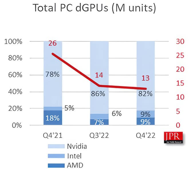 Если говорить о дискретных GPU, тут ситуация весьма любопытная. Во-первых, рынок просел с 26 до 13 млн чипов, то есть вдвое. Во-вторых, Intel каким-то образом умудрилась догнать AMD! Обе компании сейчас занимают по 9% рынка, и не очень понятно, как так вышло. Доля Nvidia за год выросла с 78% до 82%.