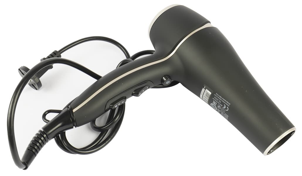 Плавные линии фена, покрытого приятным на ощупь материалом soft touch делают его весьма привлекательным и изящным. Строгость черного корпуса разбавлена вставками бежево-золотистого цвета.