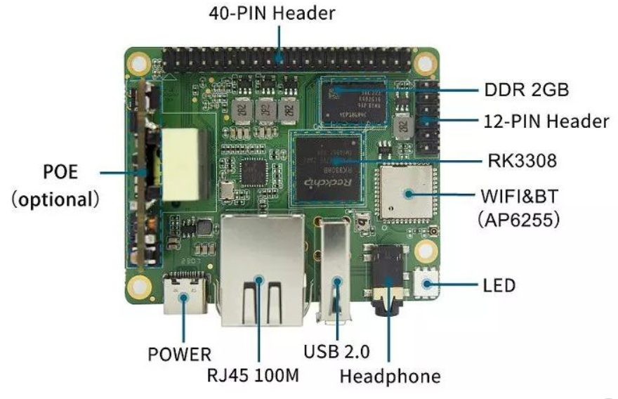 Также предусмотрен слот для карт microSD, адаптеры Wi-Fi 5, Bluetooth 4.2 и 10/100 Мбит/с Ethernet, порт USB. В основе аппаратной платформы лежит SoC Rockchip RK3308, c четырехъядерным CPU ARM Cortex-A35 частотой 1,3 ГГц.