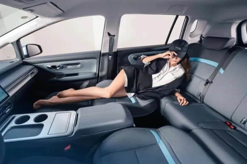 У GAC Aion Y Younger есть функция автоматического открывания дверей при приближении к автомобилю, парктроники, помогающие при движении задним ходом, Bluetooth и голосовой помощник. Передние сиденья можно сложить, убрав подголовники, чтобы получить два спальных места, как показано на фото выше.