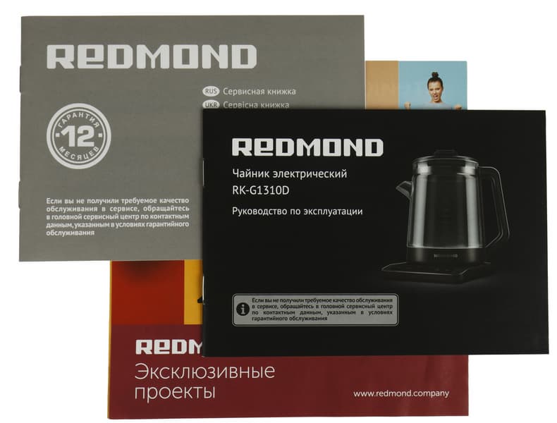 К Redmond RK-G1310D прилагается руководство по эксплуатации и сервисная книжка небольшого формата. В инструкции подробным образом расписаны правила пользования прибором: безопасность, эксплуатация, технические характеристики, уход, возможные неисправности. Учитывая то, что прибор имеет более широкие возможности, чем простое доведение воды до кипения, мы бы рекомендовали ознакомиться с инструкцией перед началом эксплуатации чайника.