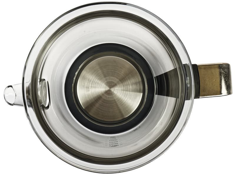 Внутри корпуса расположен дисковый нагревательный элемент. Крепление к корпусу выполнено через силиконовые прокладки и его герметичность не вызывает сомнений. Это соединение единственное в чайнике, никаких других — вставленных носиков, шкал и прочих элементов, нет.