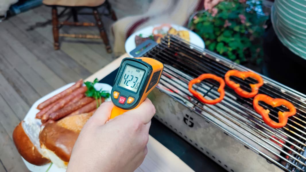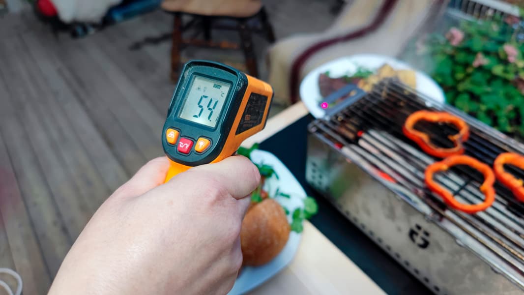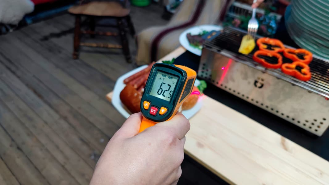 Даже с учетом того, что пирометр в силу принципа своего действия не является самым точным в мире прибором, мы считаем, что можно с уверенностью утверждать: температурный экзамен на «настольность» гриль Buddy успешно сдал. Даже 62,5 °C — это не та температура, которой можно мгновенно обжечься: неприятные ощущения вынудят вас отдернуть руку быстрее, чем это произойдет.