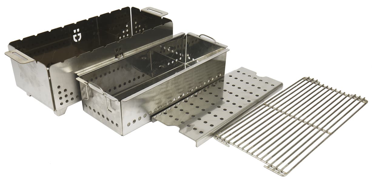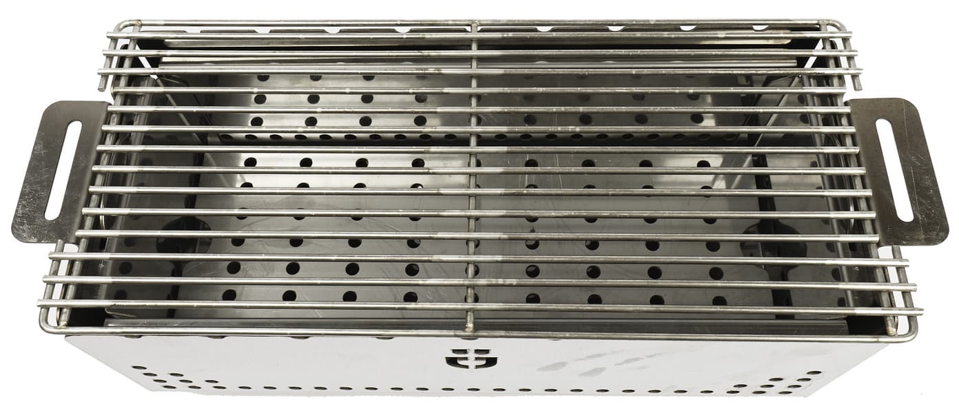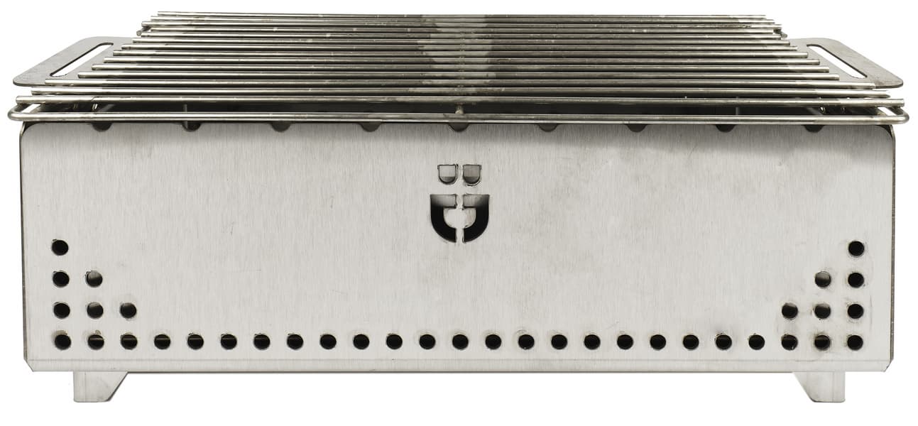 Гриль представляет собой компактную «коробочку» из нержавеющей стали, аккуратно собранную и довольно увесистую по причине использования нержавейки солидной толщины: внешняя и внутренняя коробки сделаны из стали толщиной 1,5 мм, поддон-колосник имеет толщину 2 мм, прутья решетки — 4 мм.