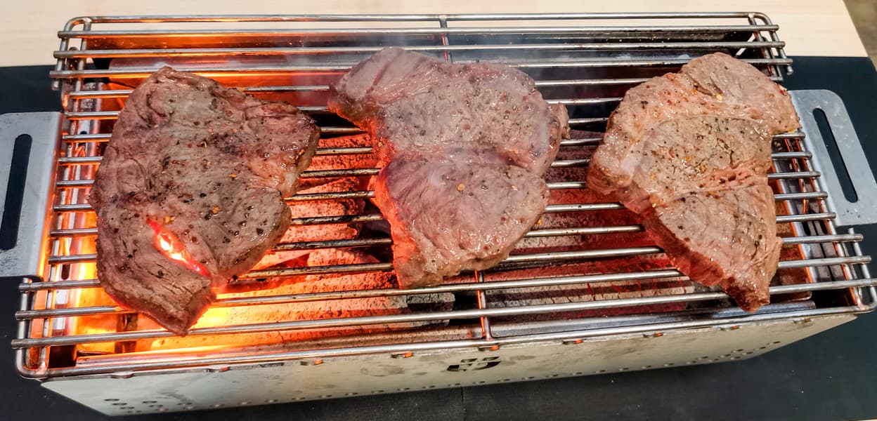 Сам кладешь, сам переворачиваешь, сам контролируешь степень прожарки — и сразу с гриля на тарелку. Есть заведения формата «гриль в столе» и в России (в основном это рестораны корейской кухни, например питерский МаккоЛи в районе Московского вокзала), но вот угольных грилей нам в них не попадалось — только газовые. А это, сами понимаете, немного не то.