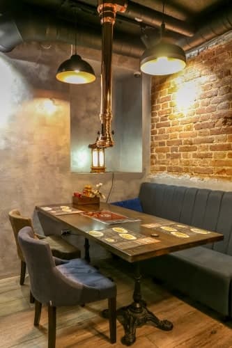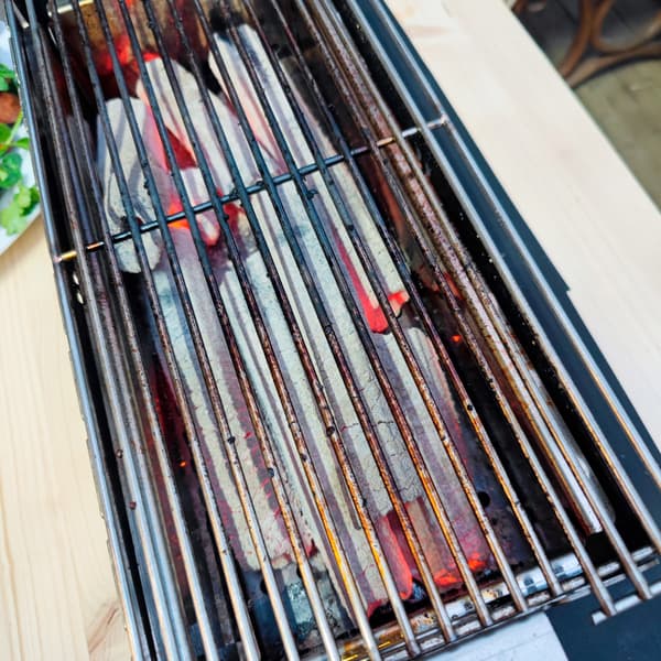 Да-да, это не ошибка: именно готовить. Потому что дальше вас проводят за стол, в середине которого будет расположен самый настоящий угольный гриль. Официант засыплет уже разожженные угли, установит решетку, принесет заказанные изделия и приборы для их жарки — и вперед!