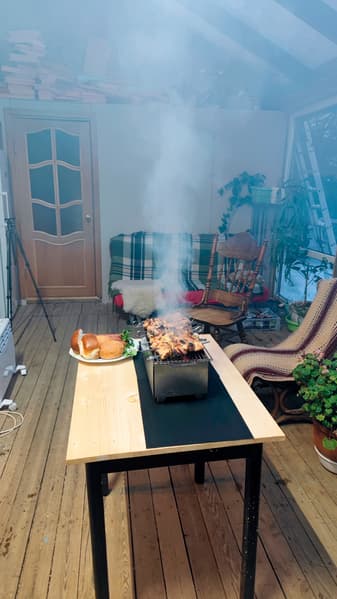 Мы решили все-таки попробовать эксплуатировать гриль в помещении, для чего была выбрана крытая веранда загородного дома. С одной стороны, это полноценное помещение, со стенами и крышей, с другой — между ней и основной частью дома есть дверь, которую можно держать закрытой, а у нее самой есть две двери, позволяющие создать сквозняк и быстро проветрить помещение. Забегая вперед: мы не раз потом похвалили свою предусмотрительность.