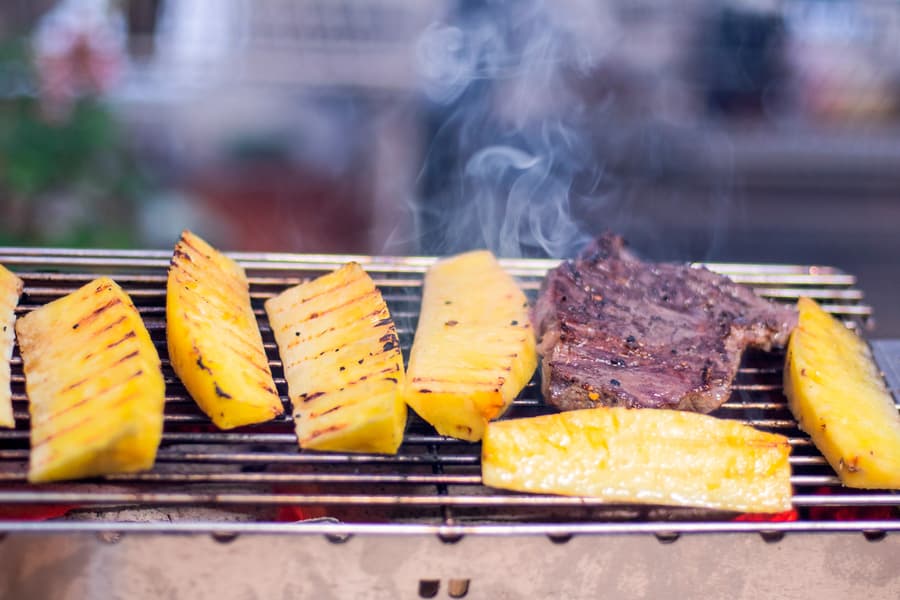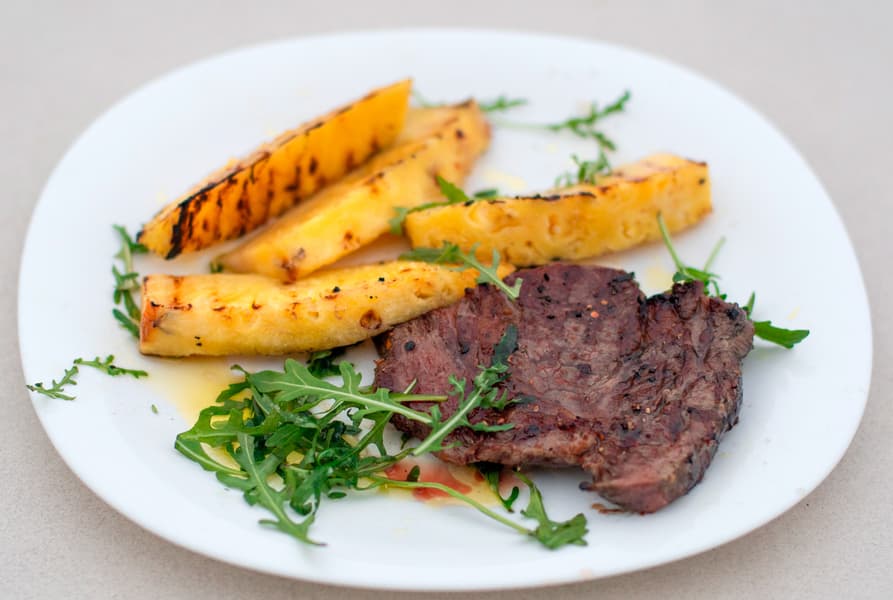 Загрузили на гриль оставшийся стейк и порезанный на сегменты и чуть присоленный ананас, сбрызнутый рафинированным маслом, чтобы не прилипал к решетке. Этот стейк — для любителя хорошей прожарки.
